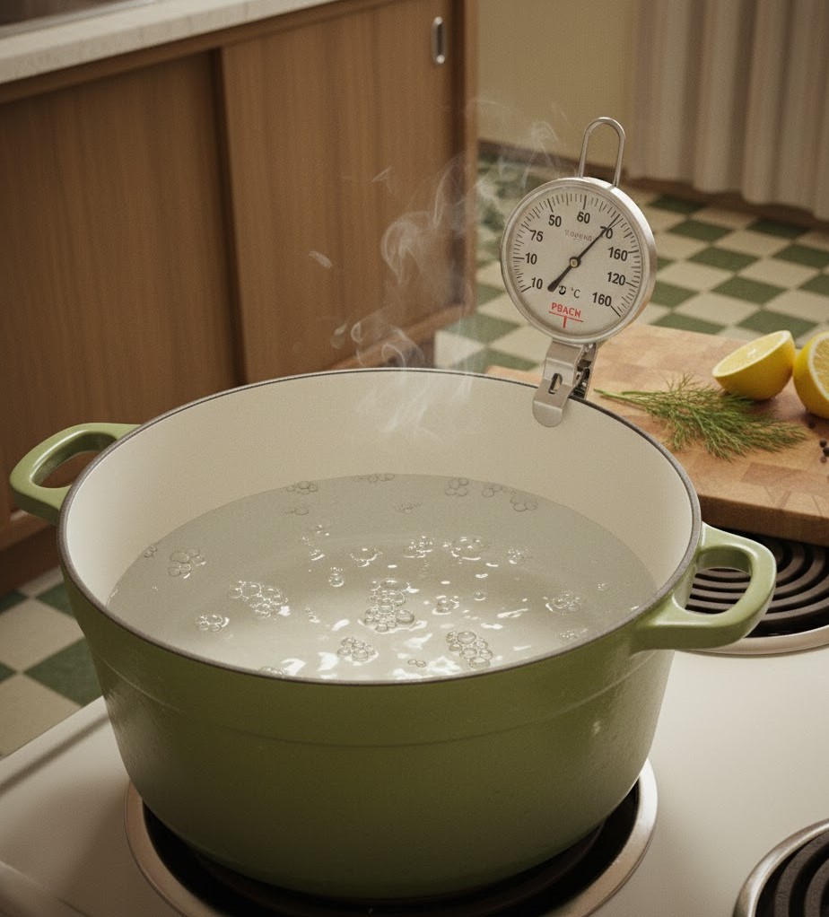 60°C – 82°C: Ήπιες κινήσεις στην επιφάνεια του υγρού, μερικές μικρές φυσαλίδες στον πάτο. Ιδανικό για αυγά και ψάρι.